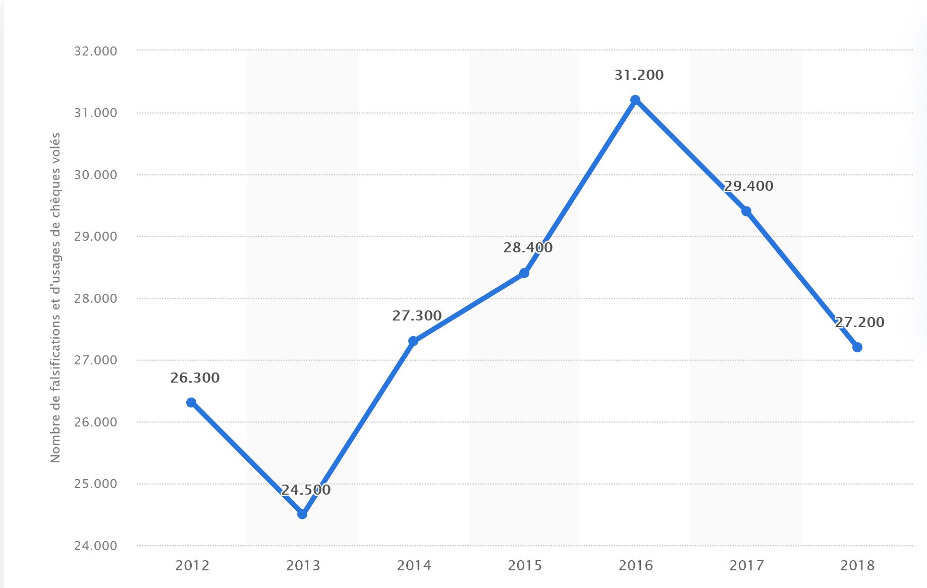 La fraude par les chèques représente quasiment la moitié de la fraude « argent », supérieure à celle par les cartes bancaires (540 millions en 2019 contre 470 millions d’euros pour la carte) dont l’utilisation est pourtant 120 fois celle du chèque !