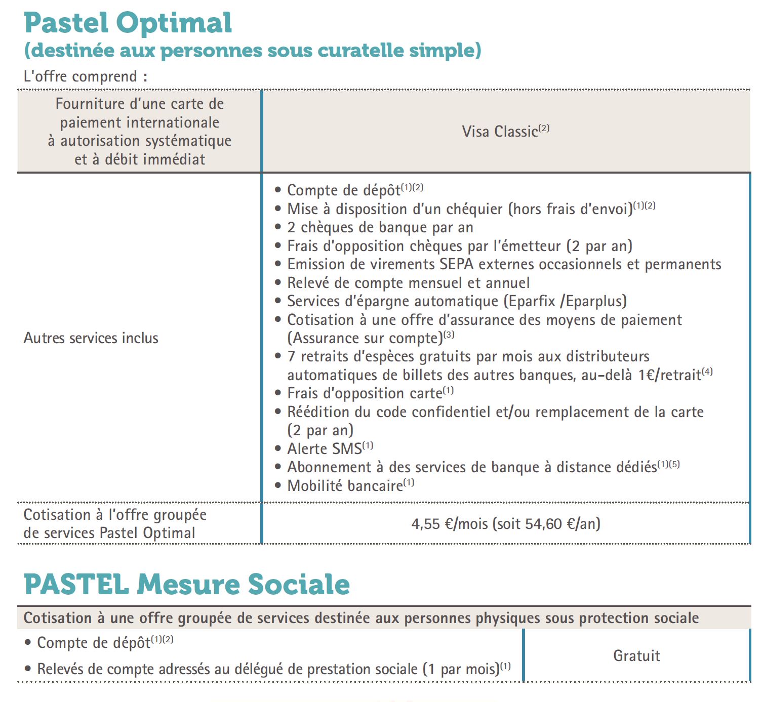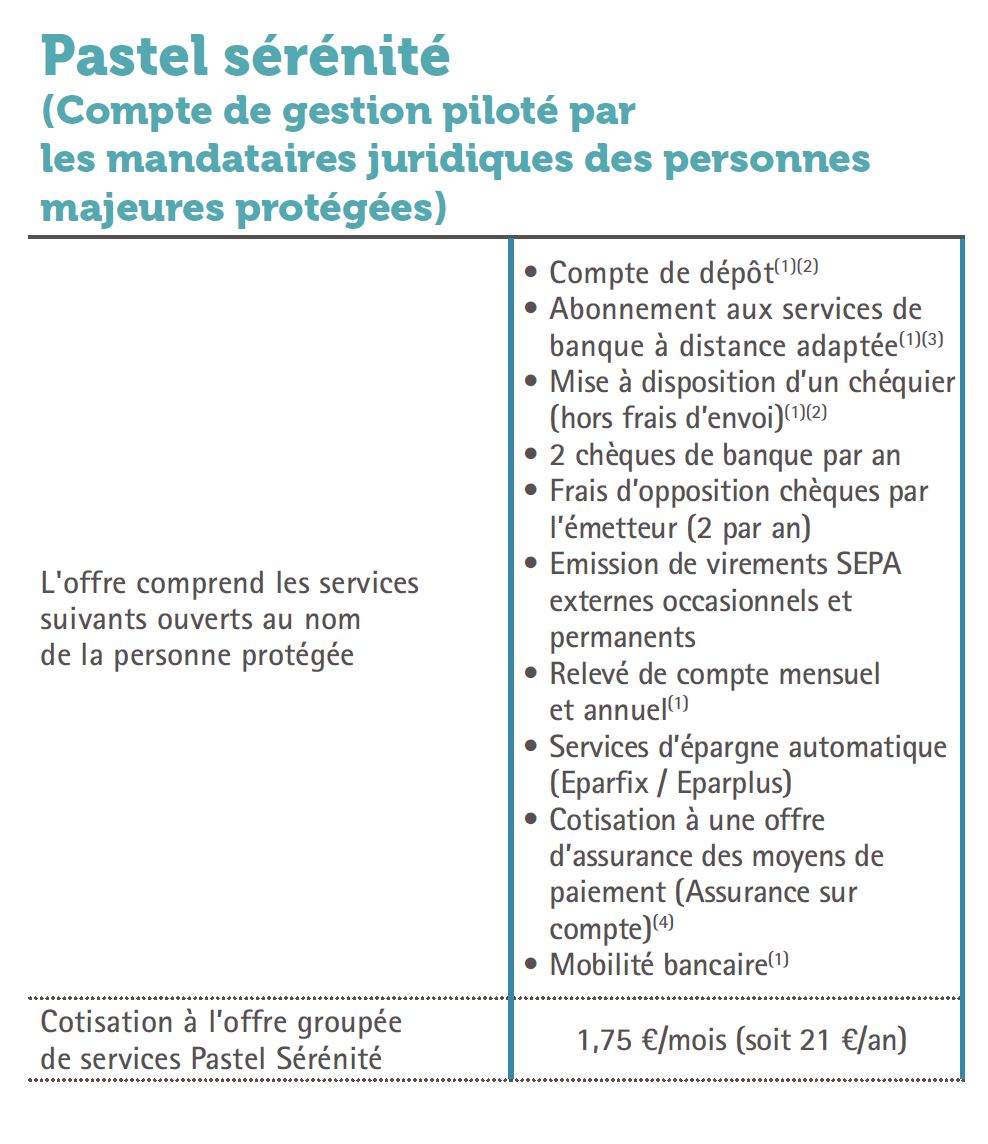 En ce qui concerne les personnes protégées, les formules du Crédit Coopératif s’appellent les formules PASTEL. avec Pastel Sérénité (avec Pastel Carte en option) , ainsi que Pastel Optimal et Pastel Mesure Sociale.